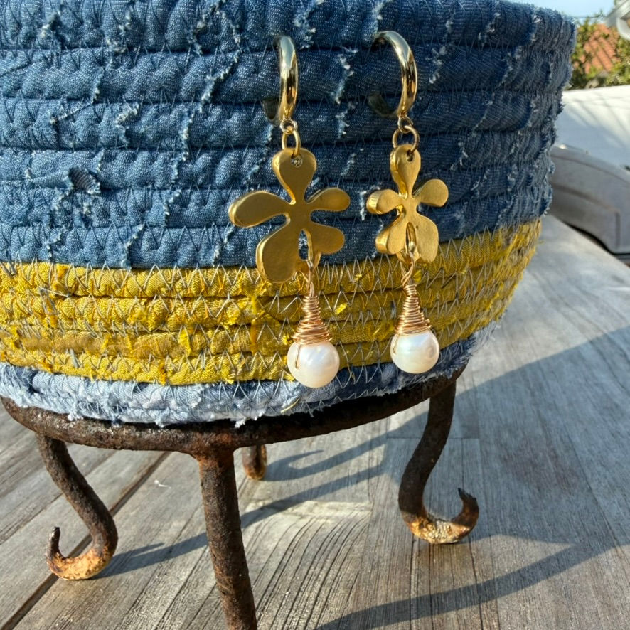 Handcrafted Pearl Dangle Earrings with Gold Flower