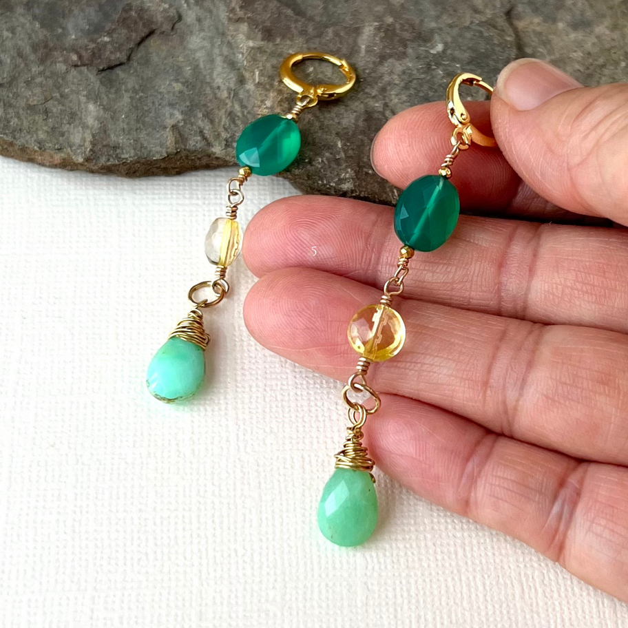 Triple Gemstone Dangle Earrings · Onyx, Citrine & Chrysoprase