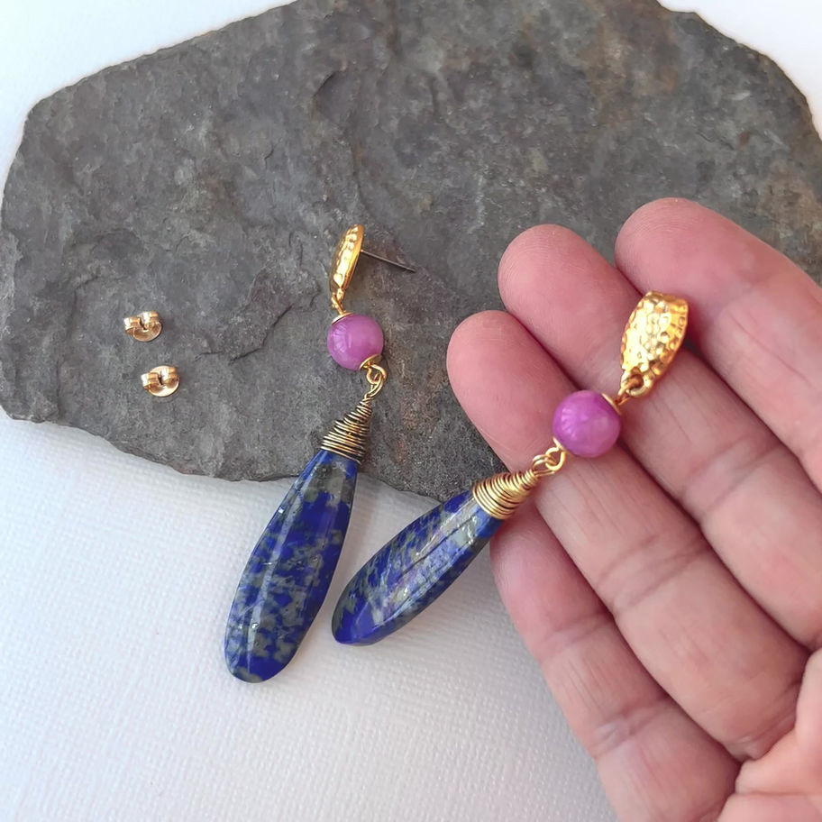 Add some elegance and sophistication to your accessory collection with these Lapis Lazuli Gemstone Drop Earrings. Each earring features a handcrafted gold plated wire wrapping that holds a stunning lapis lazuli gemstone, which is known for its deep blue hue. To add a pop of color and contrast, a magenta lavender quartzite gemstone completes the design. The earrings are finished with a hammered gold post ear stud, making them easy and comfortable to wear for any occasion. These earrings are the perfect accessory to elevate your holiday party look or to add a touch of glamour to your everyday style.
