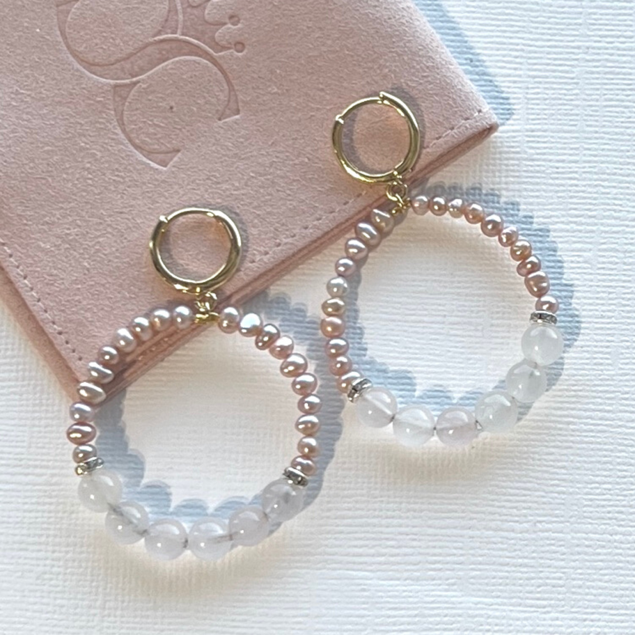 Delicately colored hoops of rose quartz gemstones with pink freshwater pearls. A beautiful gift for someone special or treat yourself to this wonderful heart chakra gemstone that has loving fluid energy.